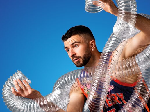 Ultra-modern pop-punk juggling! Surrounded by a huge inflatable blue structure and accompanied by electro beats…