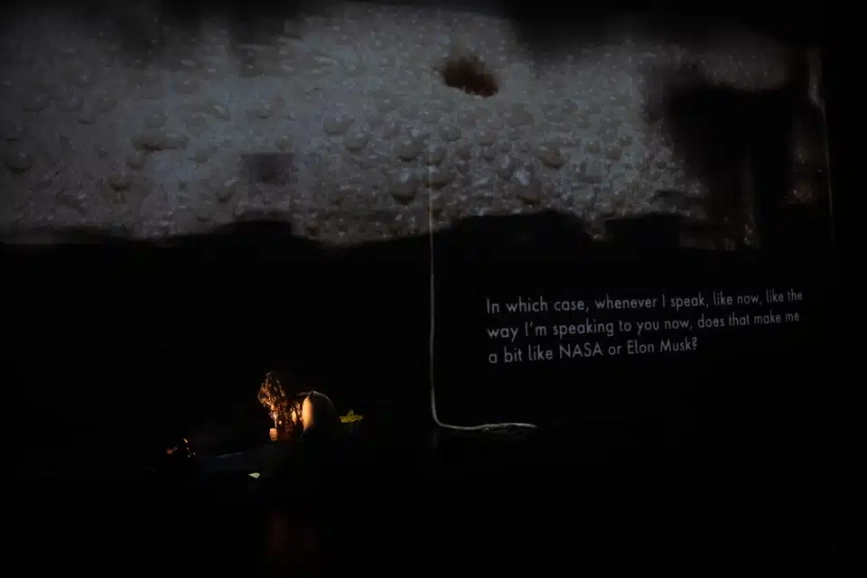 As an artist/writer, I often explore personal autobiographical experiences in contrast to, and in relationship with, broader social narratives. Political events over the last three years have particularly led me to question myself, my identity and the place that I and others occupy in the world. With A Spectacle of Herself, I wanted to explore the link between mental health and personal identity in tandem with these bigger-scale political expressions of space-taking. This includes the “space race” led by billionaires to colonise Mars and the global climate disaster we are witnessing. Patriarchy and objectification are central themes in this work, given the way that space is often policed, organised and monopolised