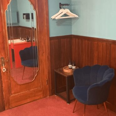 The bespoke wall feature is still to be installed. The design is a bold Art Deco-inspired illustration of the Assembly Hall, completed in colours that complement the rich hues of the rest of the design. We hope our guests in the dressing room enjoy taking selfies in front of this unique feature.