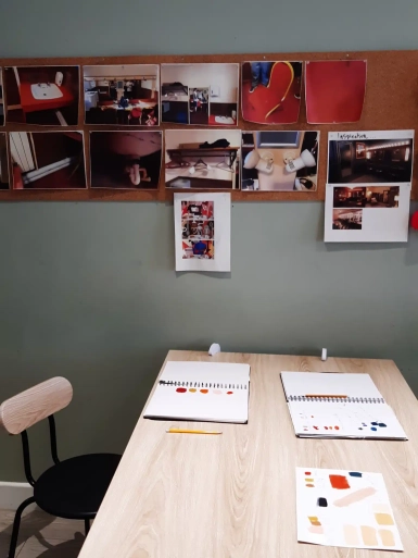 To begin their work, the trainees considered the space they were working in. The room’s layout and functionality, the practicality of the design, and the architecture of the Assembly Hall are all important factors. Their colour choices and design aesthetic have been inspired by features around the building. They took photos to create a moodboard and help develop their ideas. In considering the ‘instagrammable wall’ aspect of the brief, they shared their colour schemes and design ideas with one of the trainees on the art pathway.